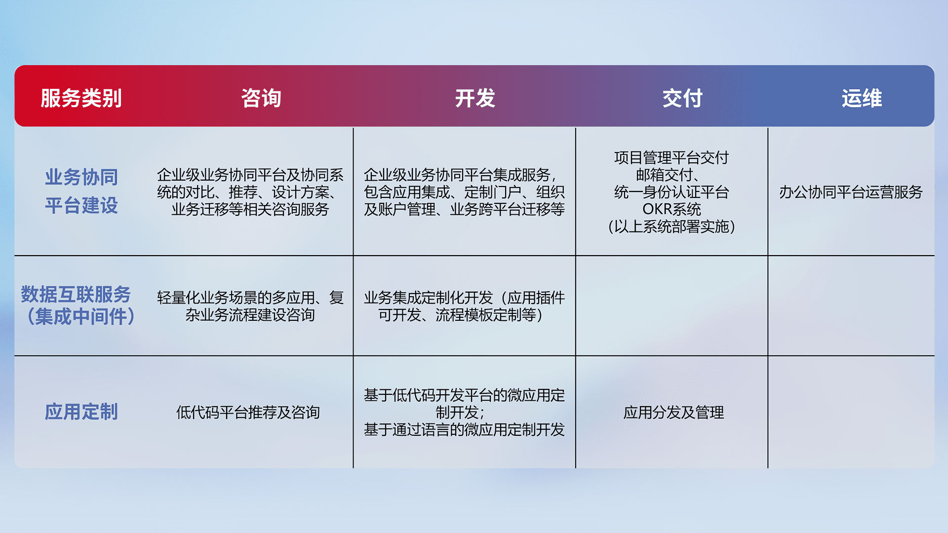 针对钉钉、、、企微、、、、IDaas等平台级产品提供产品的规划、、、方案、、、、交付、、定制化开发等服务,,,实现如统一协同办公、、智能客户服务、、、混合会议管理、、、、智能数据查询、、等业务场景,,实现数字化转型。。